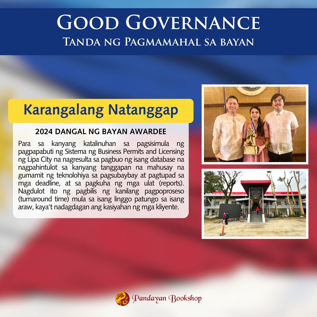 Nakikiisa ang Pandayan Bookshop sa pagtataguyod at pagdiriwang ng mga natatanging indibidwal at institusyon na nagpakita ng malasakit at pagmamahal sa larangan ng serbisyo publiko bilang patunay na buhay ang GOOD GOVERNANCE sa ating lipunan.